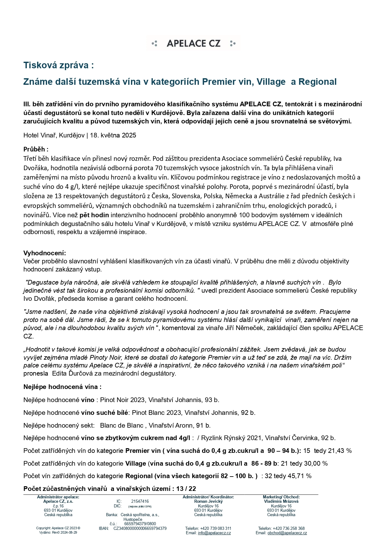 Vyhodnocení III. běhu klasifikace vín APELACE CZ/ Více info